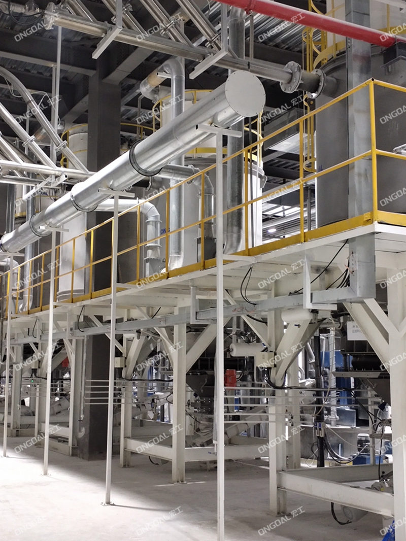 在物料預處理環節,創新采用噸包破包工作站,對1種重鈣與3種輕鈣原料進行集中拆包處理,配置專用除塵裝置實現無塵化作業。四類物料經封閉式管道分別輸送至獨立的大型儲料倉,通過倉體結構優化與流化裝置設計,有效避免粉體板結、架橋等問題,確保原料存儲穩定性。